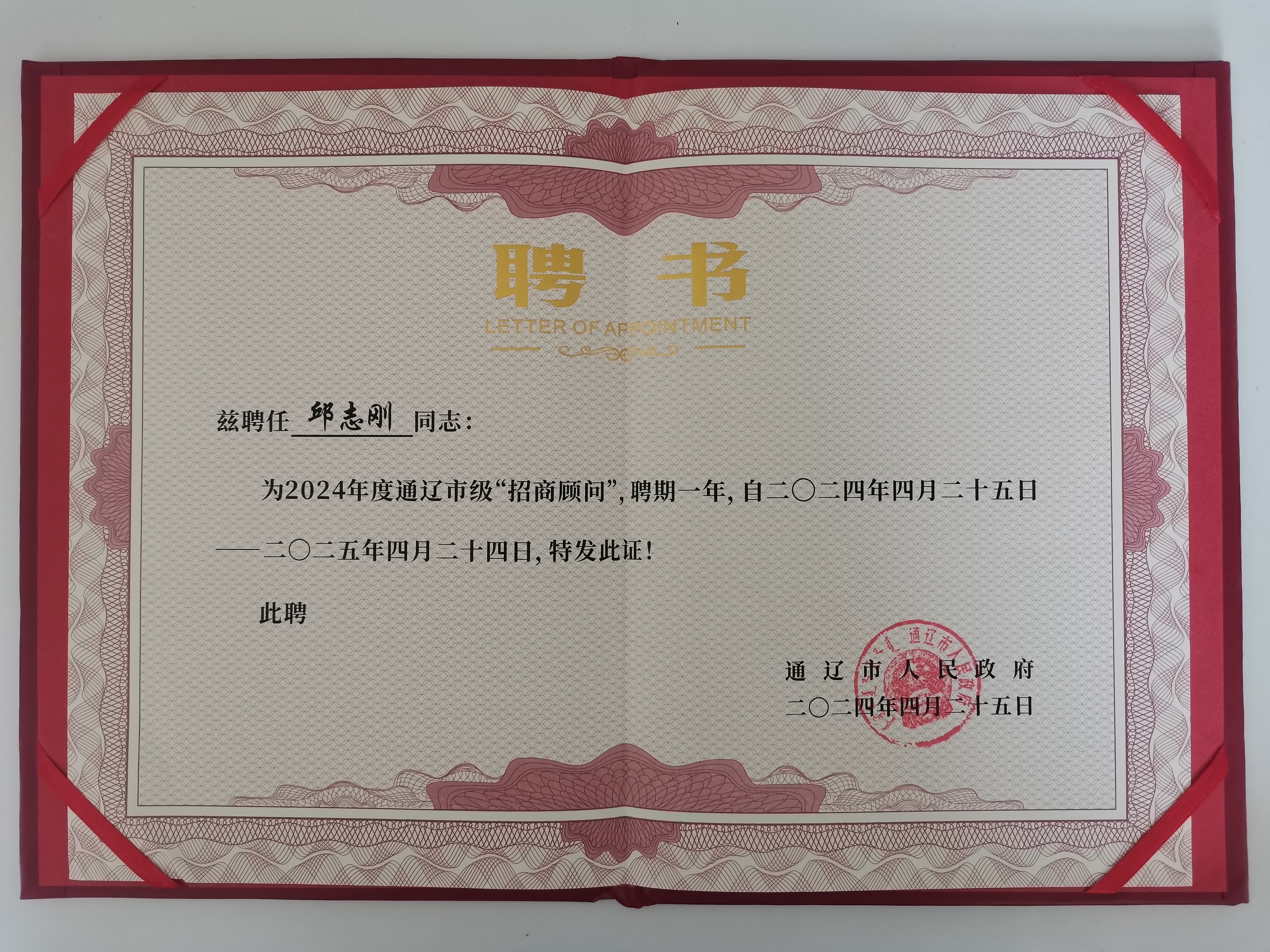 邱志剛先生的努力得到了通遼市政府的高度認(rèn)可,他收到了通遼市政府的感謝信,信中對(duì)他在招商引資工作中所作出的杰出貢獻(xiàn)表示衷心的感謝。